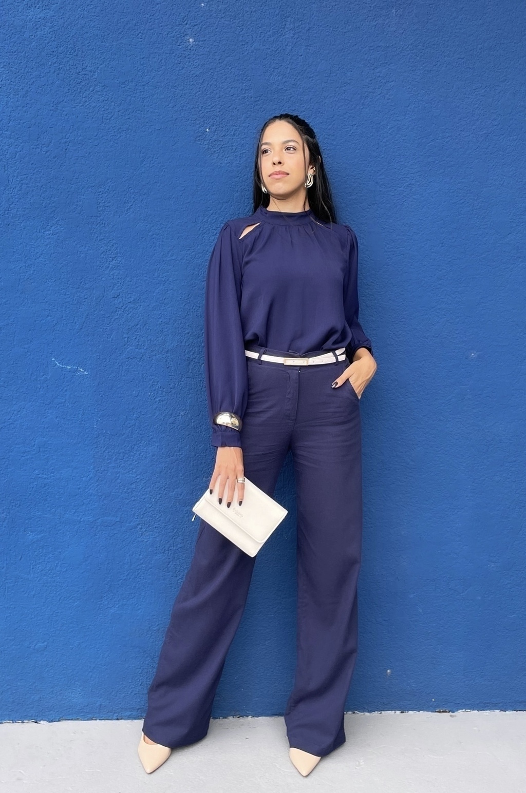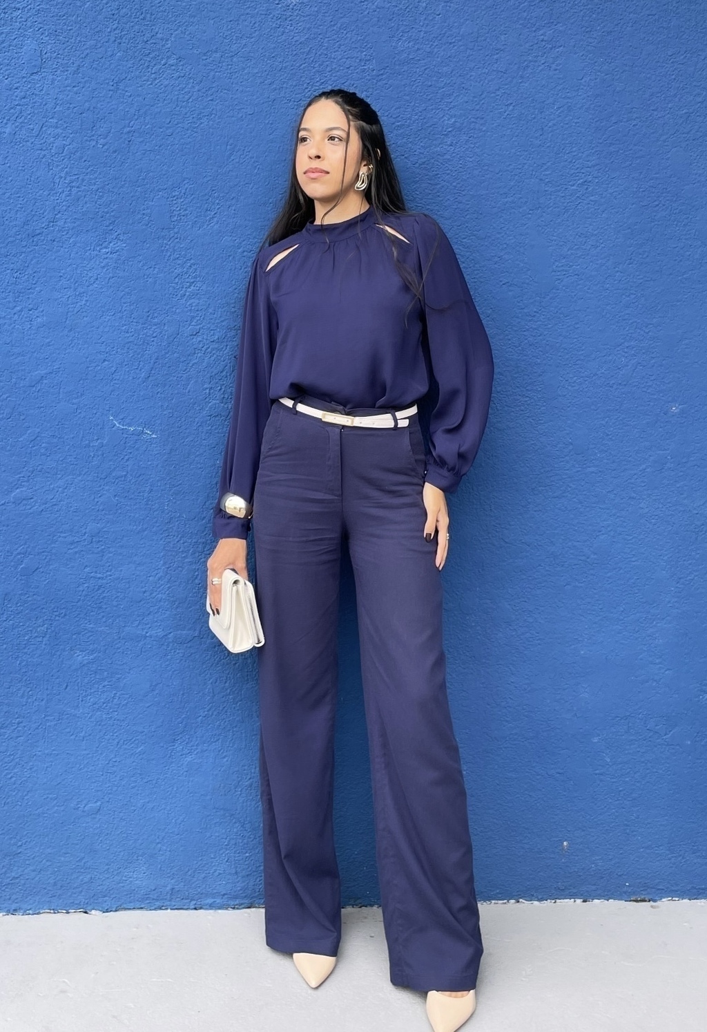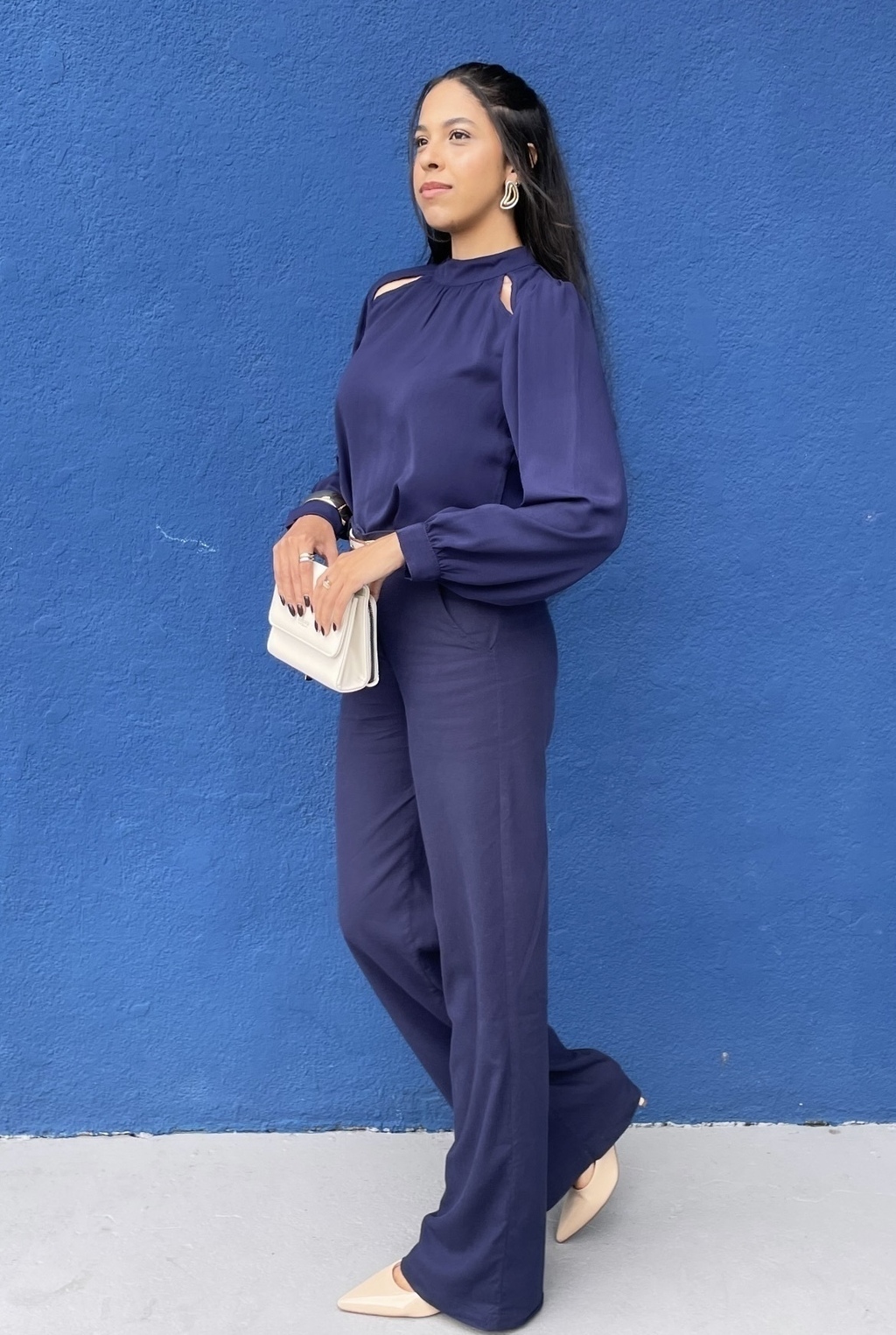 Blusa manga longa, com recorte nos ombros e fecho em botão no punho.