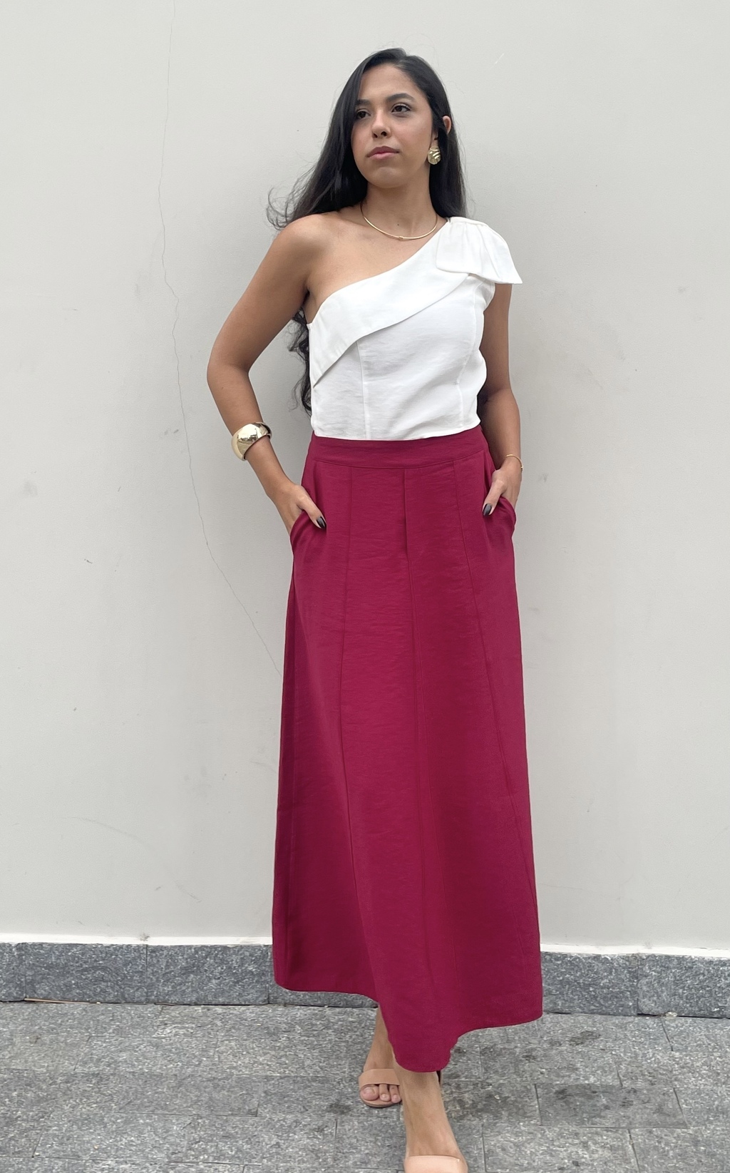 Blusa assimétrica, confeccionada em viscose com laço no ombro e fecho em zíper invisível na lateral