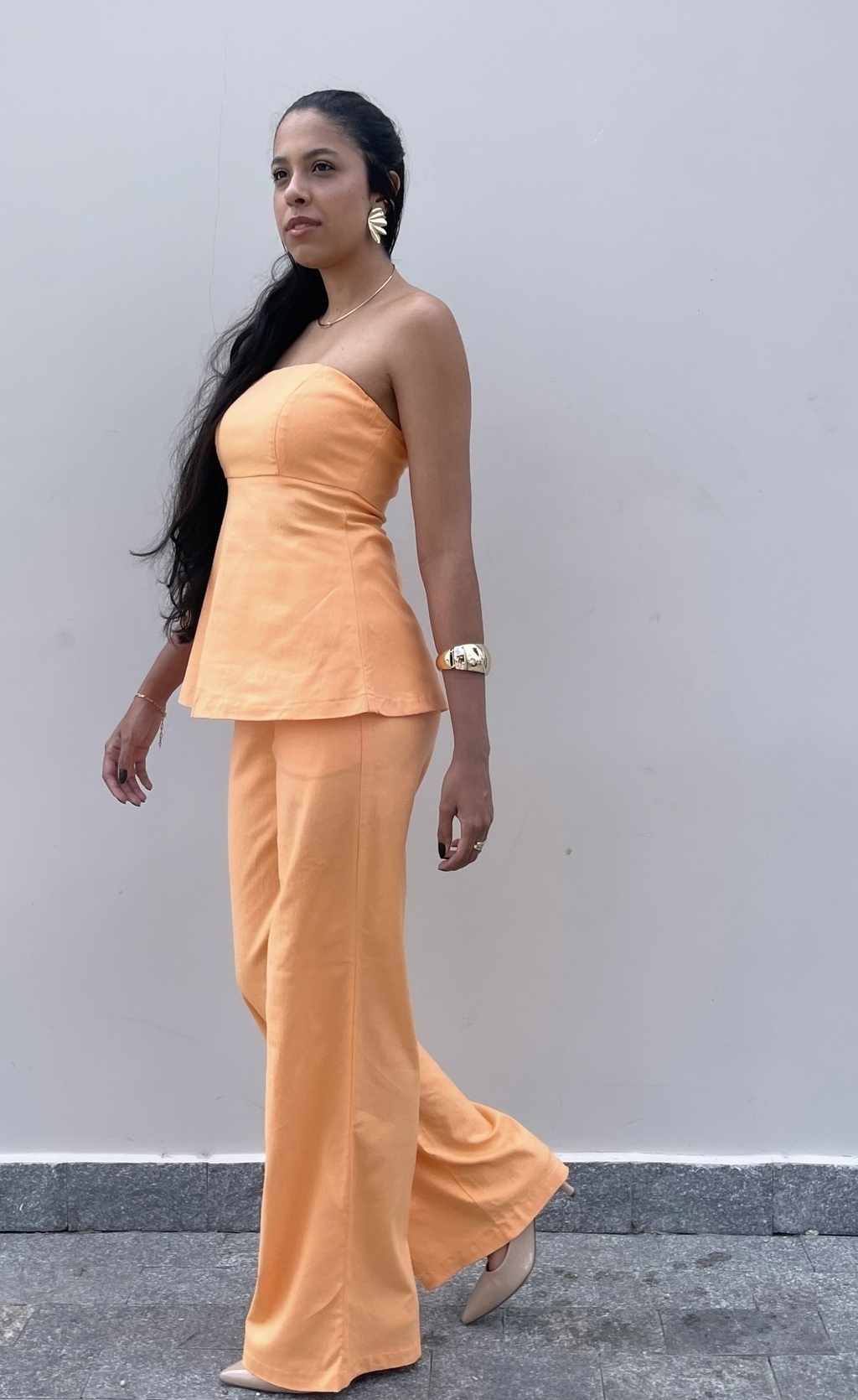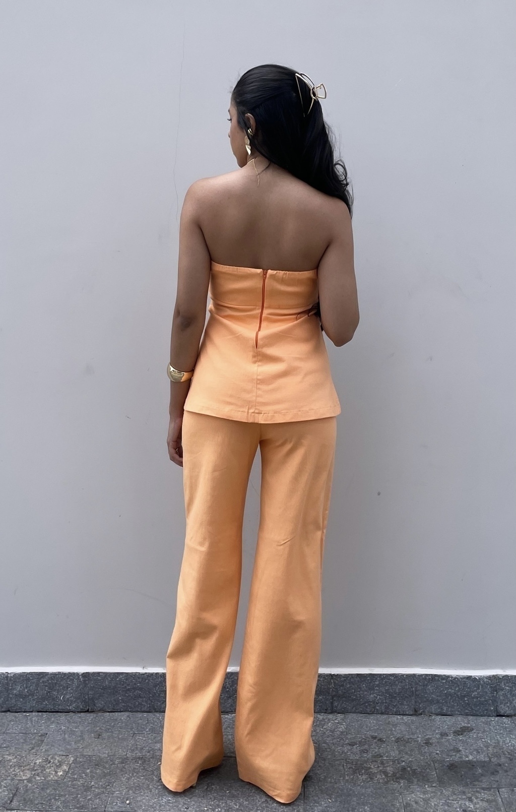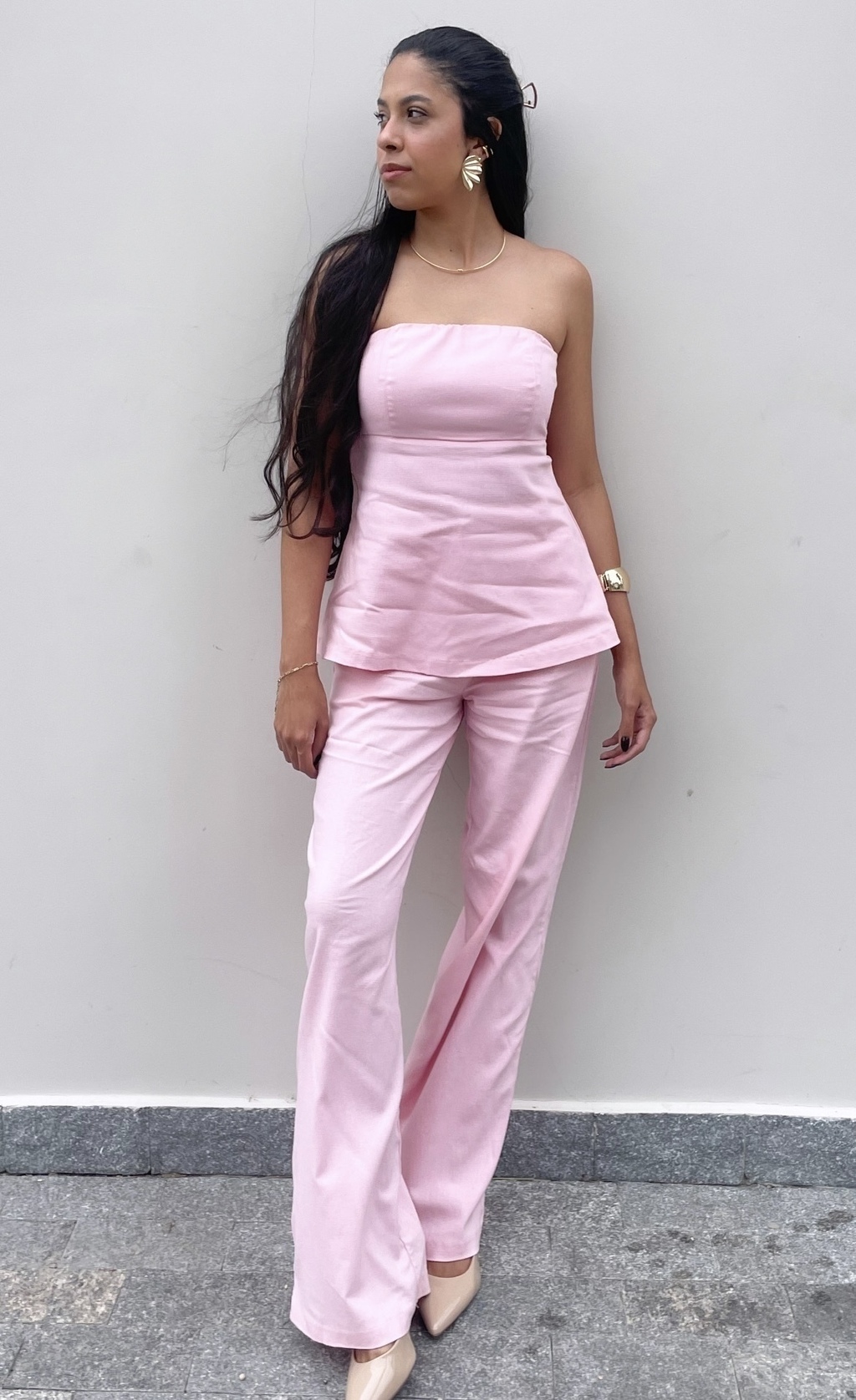 Conjunto confeccionado em linho com viscose, possui um caimento impecável, blusa no decote sem alças, com fechamento em zíper nas costas e calça no modelo pantalona com bolsos laterais.