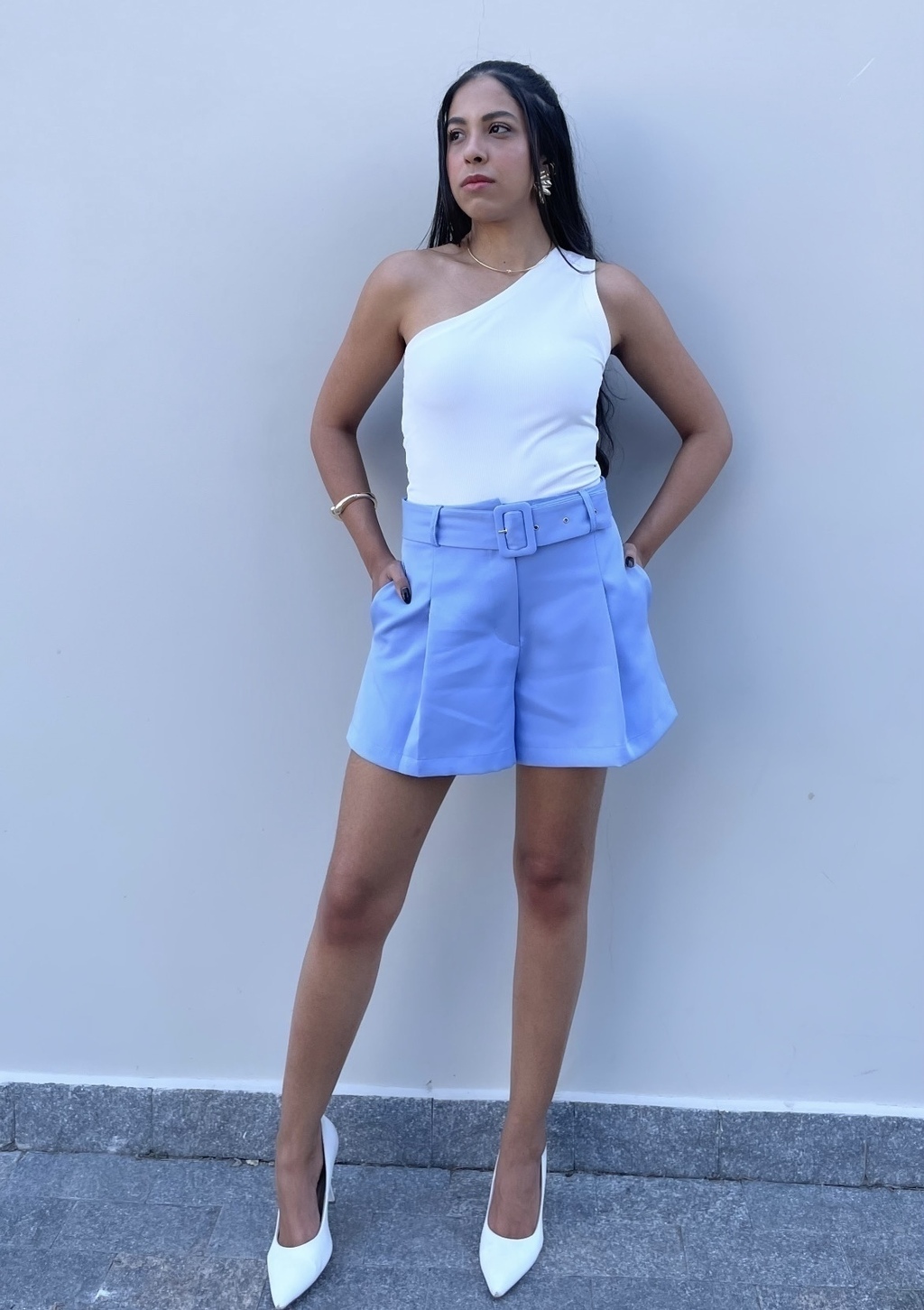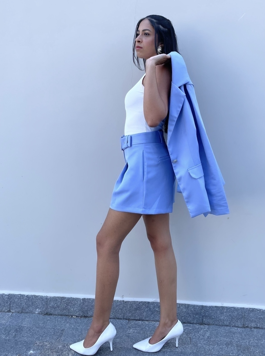 Conjunto de alfaiataria composto por blazer e short em um elegantíssimo tom de azul bebê. Blazer com fecho em botão e forro, short com fecho em botão invisível, bolsos laterais e acompanha cinto encapado no mesmo tom.